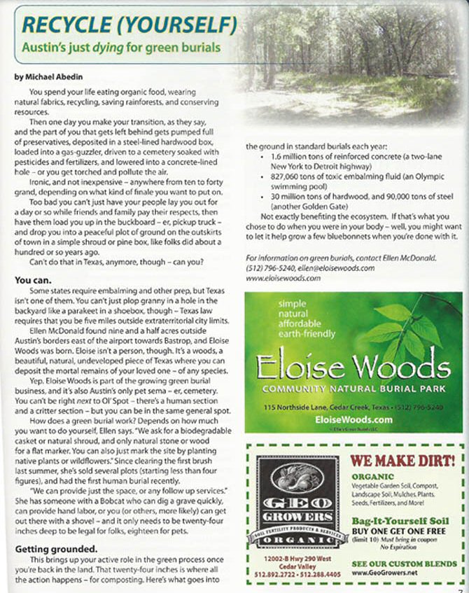 Park Map The terrain varies slightly throughout the gardens of Eloise Woods. We hope you find peace wandering the trails. Eloise Woods in the Media HBO: Alternate Endings Jewish Outlook Natural Awakenings Ashes to Ashes by Keegan Curry A Present Death by Mitchell O’Hearn